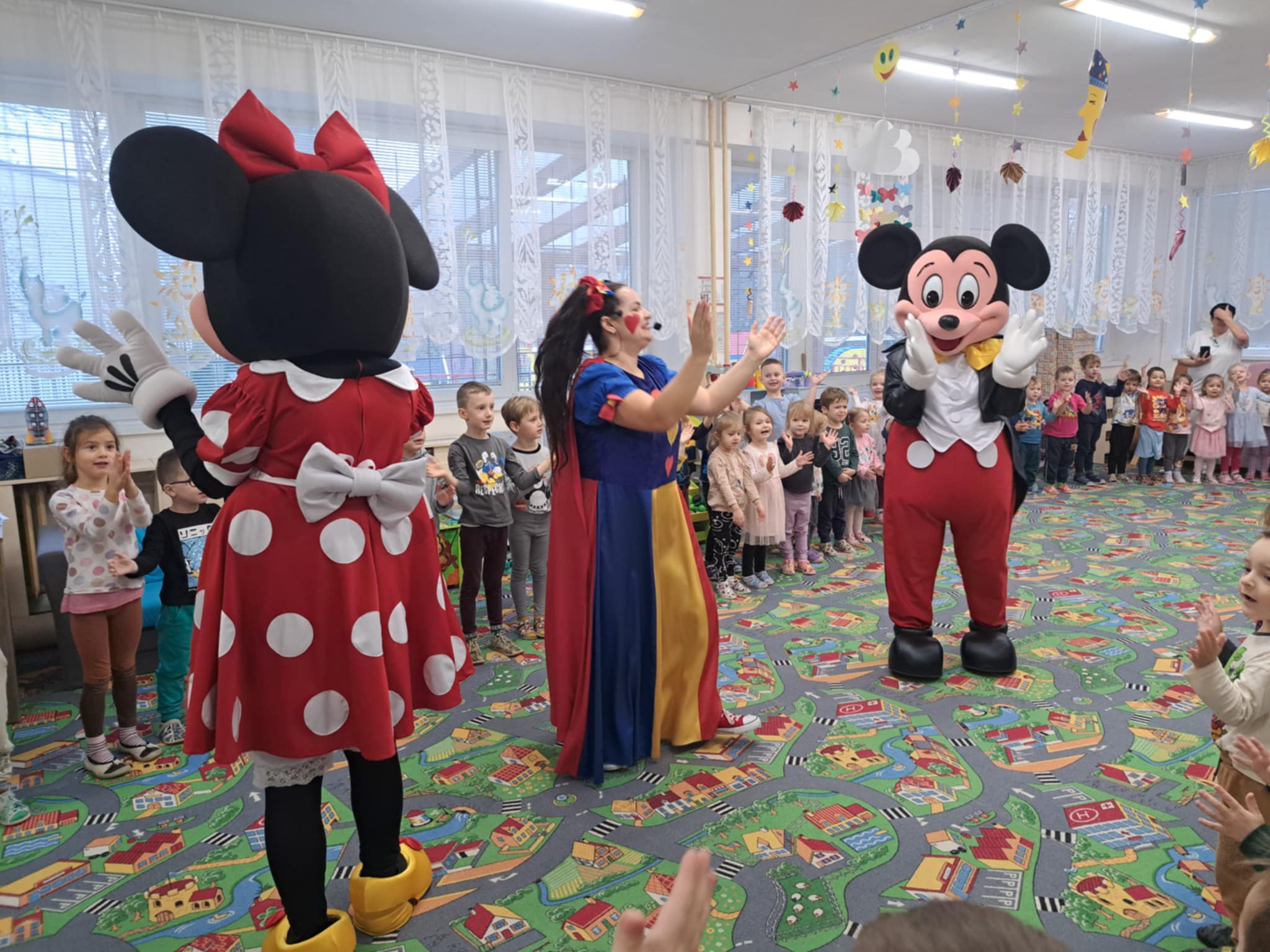 Dňa 20.11. k nám zavítala SMEJLINKA tentokrát si so sebou vzala na pomoc maskotov MInnie a Mickey. Detičky sa veľmi tešili. Spolu so Smejlinkou a maskotmi si zatancovali zaspievali. Predviedli nám krásny animačno-zábavný program. Nakoniec sa všetci na pamiatku chceli fotiť a objímať so Smejlinkou a Minnie a Mickey. Už teraz nám chýbajú.