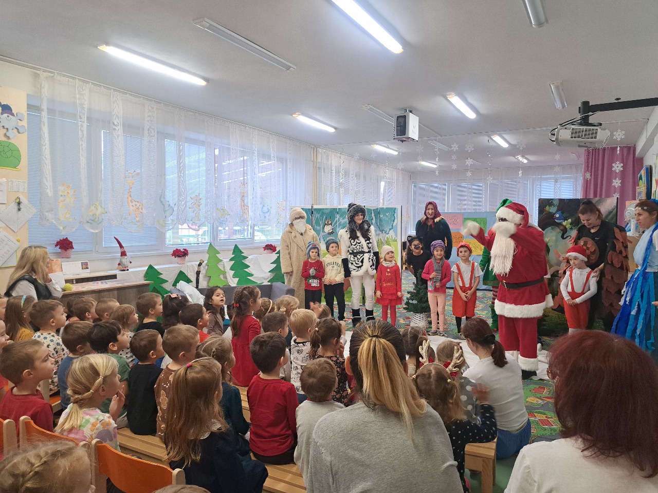Dňa 05.12. si pre naše deti pripravili divadielko pani učiteľky a niektorí predškoláci. Spoločne si zaspievali zimné piesne, zatancovali nám trpaslíci aj vetrík. A všetci sme spoločne pomohli Mrázikovi napraviť chybu a rozmraziť Perinbabu, aby konečne nasnežila. Nakoniec k nám prišiel aj Mikuláš !